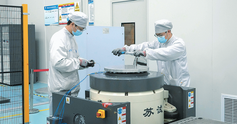 图为环境试验人员正在调试振动台设备,为产品力学试验做准备。张双莹 摄